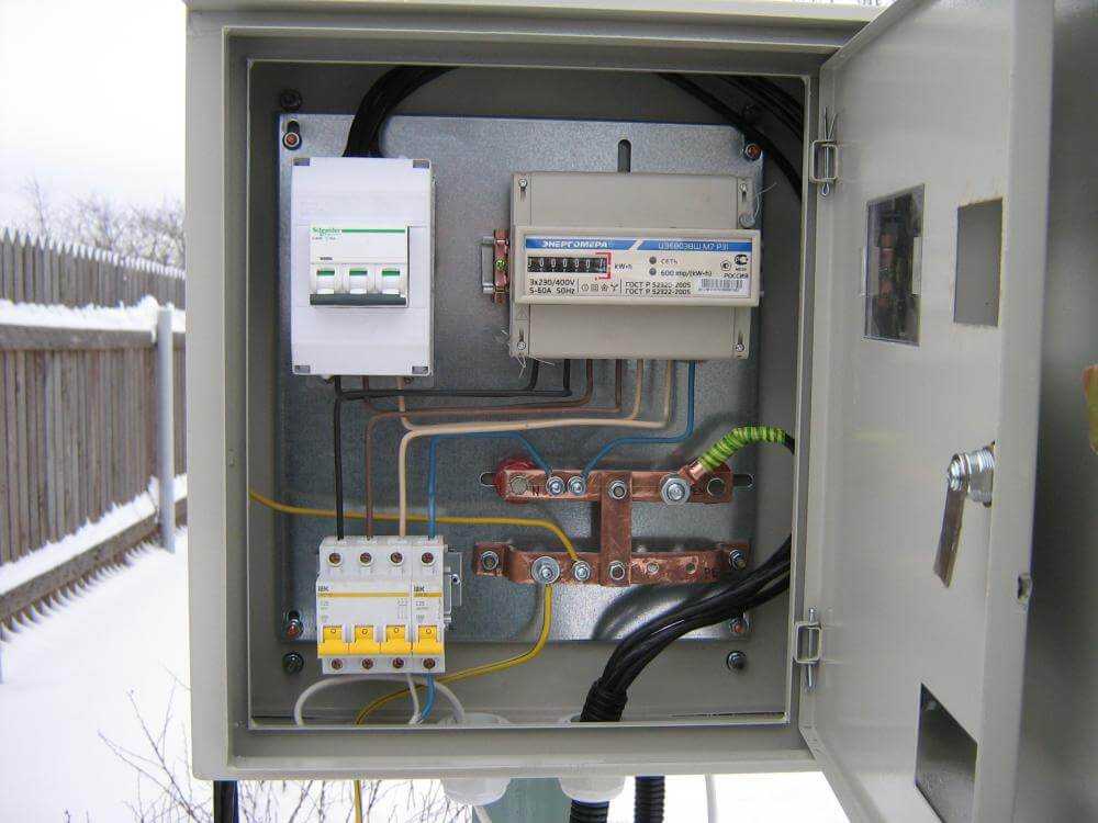 Силовой щит рекомендуется устанавливать на фасад здания, далее провода идут уже от него по всем помещениям. При наличии электрифицированных пристроек, питающая линия подводится к ним также от щитка. Для подключения и учета потребленной электроэнергии необходим трехфазный счетчик. В основном используются устройства прямого включения, принцип работы которых напоминает однофазный счетчик. В этом случае требуется всего лишь правильно соблюдать схему подключения устройства, размещенную на его задней крышке или в техническом паспорте.