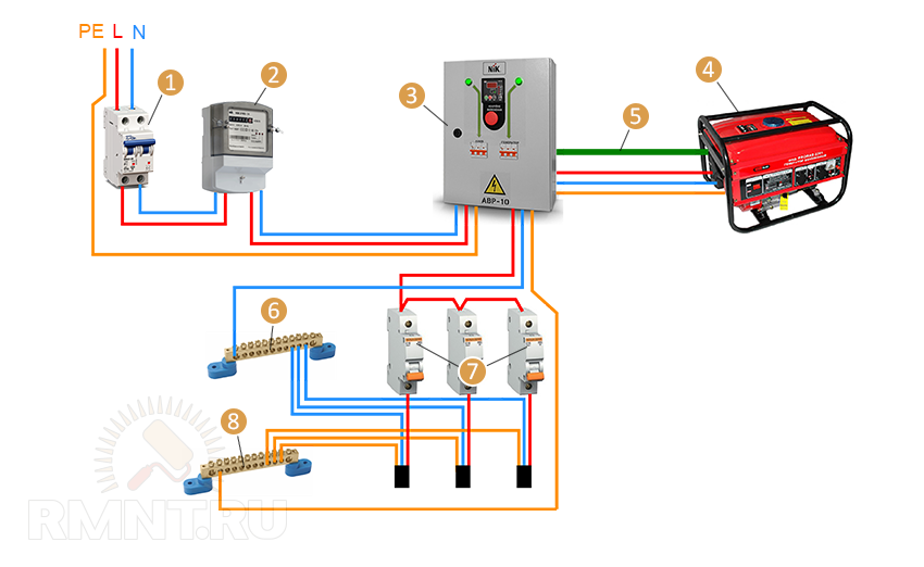 1. Вводной автомат. 2. Счетчик электроэнергии. 3. АВР. 4.Генератор. 5. Управляющий кабель. 6. Автоматы потребителей. 7. Нулевая шина. 8. Шина заземления.