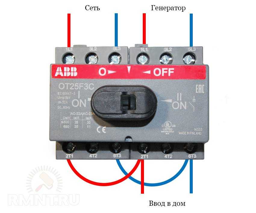 Важно помнить, что трёхпозиционный (перекидной) рубильник работает по принципу выключателя нагрузки, в нём не предусмотрено ни теплового, ни электромагнитного расцепителя. Поэтому каждый ввод нужно дополнительно защищать автоматом, предельный ток которого определяется допустимой нагрузкой на питающую линию