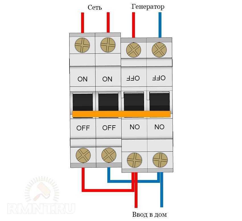 Альтернативой 3-позиционного переключателя может стать установка рядом пары двухполосных автоматов, но повёрнутых друг к другу на угол 180 градусов. Клавиши обеих устройств скрепляют штифтами через специально предусмотренные для этих целей отверстия. В работе при переключении клавиш, например, вниз, такая комбинация автоматов будет блокировать питание сети от внешней линии и открывать путь для электротока, вырабатываемого автономным генератором. Обратное же действие с клавишами приведёт к пропуску тока из линии электропередач и блокировке поступления энергии от генератора.