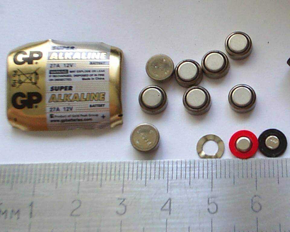 Или использовать готовую 12В батарейку с маркировкой 23АЕ или 27А, такие используются в пультах дистанционного управления. В ней внутри подборка из маленьких «таблеток», которые вы видите на фото.
