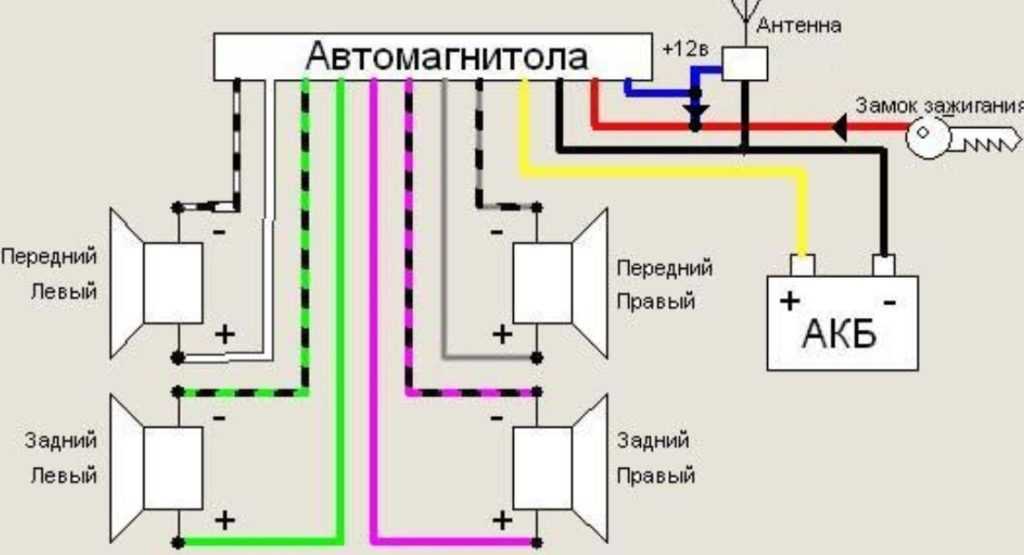 Цвета проводов подключения аудиосистемы могут несколько различаться. А вот на питание и массу будут именно такие цвета.