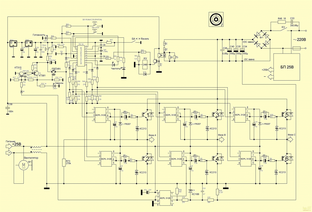 Трехфазный мост на транзисторах с диодами обратной связи я использовал, которые имелись. Управление осуществил через оптодрайвер HCPL 3120 микроконтроллером PIC16F628A. У входа припаял гасящую емкость, чтобы электролиты заряжались плавно. Затем припаял шунтовое реле. Еще установил триггер защиты тока от замыкания и перегрузки. Для управления установил две кнопки и выключатель для обратного вращения.