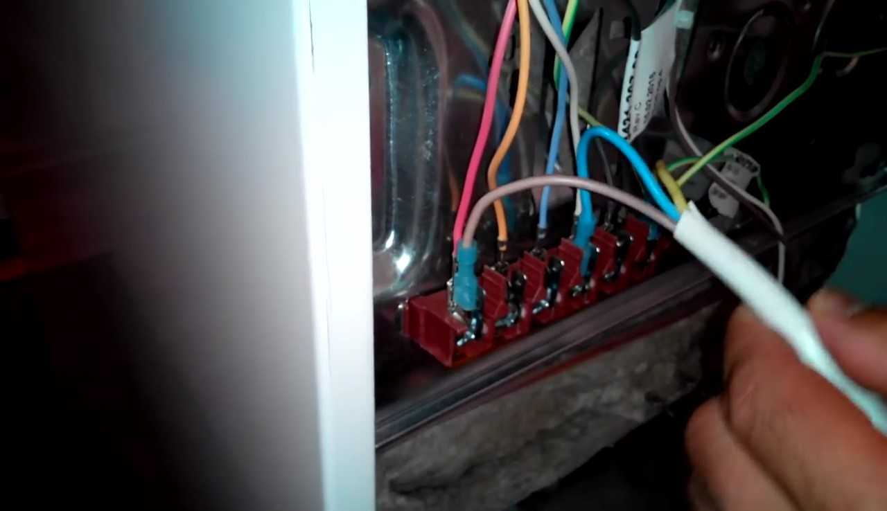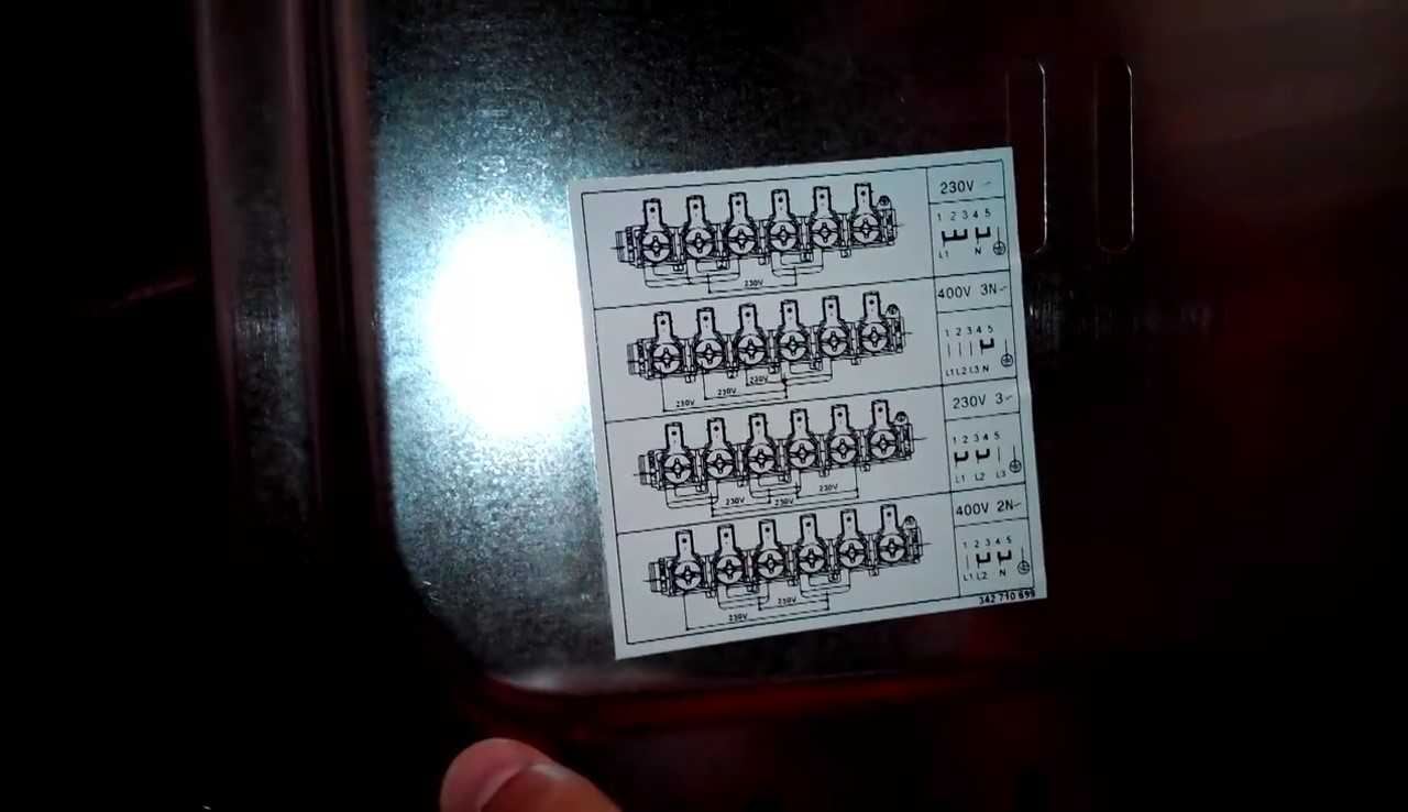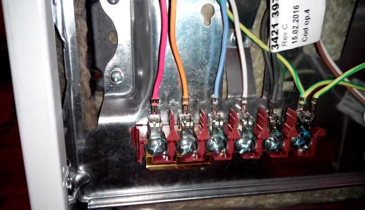 Крайняя правая клемма предназначена для заземления. Это видно по цвету изоляции присоединенных проводов. Остальные клеммы пронумерованы, для того чтобы можно было выполнить соединения в зависимости от разновидности электросети. Для этого на задней крышке приклеен шильдик с изображениями соединений для каждой из сетей.