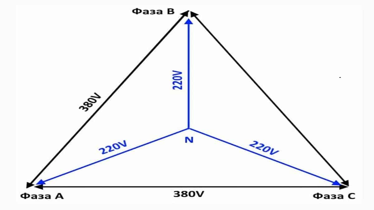 В трёхфазной сети ток подаётся таким образом, что все три сдвинуты относительно друг друга на 120 градусов. Напряжение между фазами составляет 380 В, а между фазой и нейтралью 220 В (см.рис. 1). Именно это напряжение подаётся в каждую квартиру.