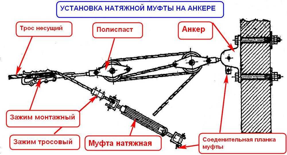 Шаги по подключению кабеля на несущем тросе, такие же, как и при подключении проводов СИП. Только между домом и опорой натягивается несущий стальной трос. Для крепления троса к стене дома и к столбу применяются анкеры с петлями для тросов или натяжные муфты, которые крепятся к анкерам муфтовыми соединительными планками (смотри фото).