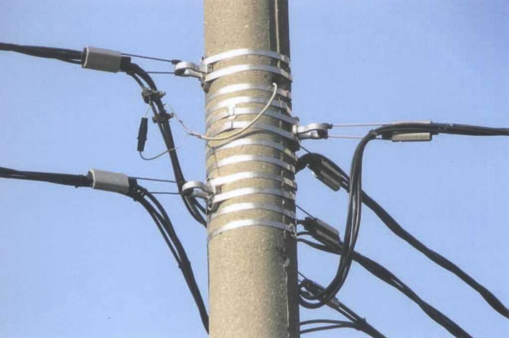 Сами провода подключаются к проводам магистральной линии специальными плашечными зажимами к неизолированным проводам или прокалывающими зажимами к изолированным проводам.А на тросе кабели крепяться кабельными бандажными ремешками.