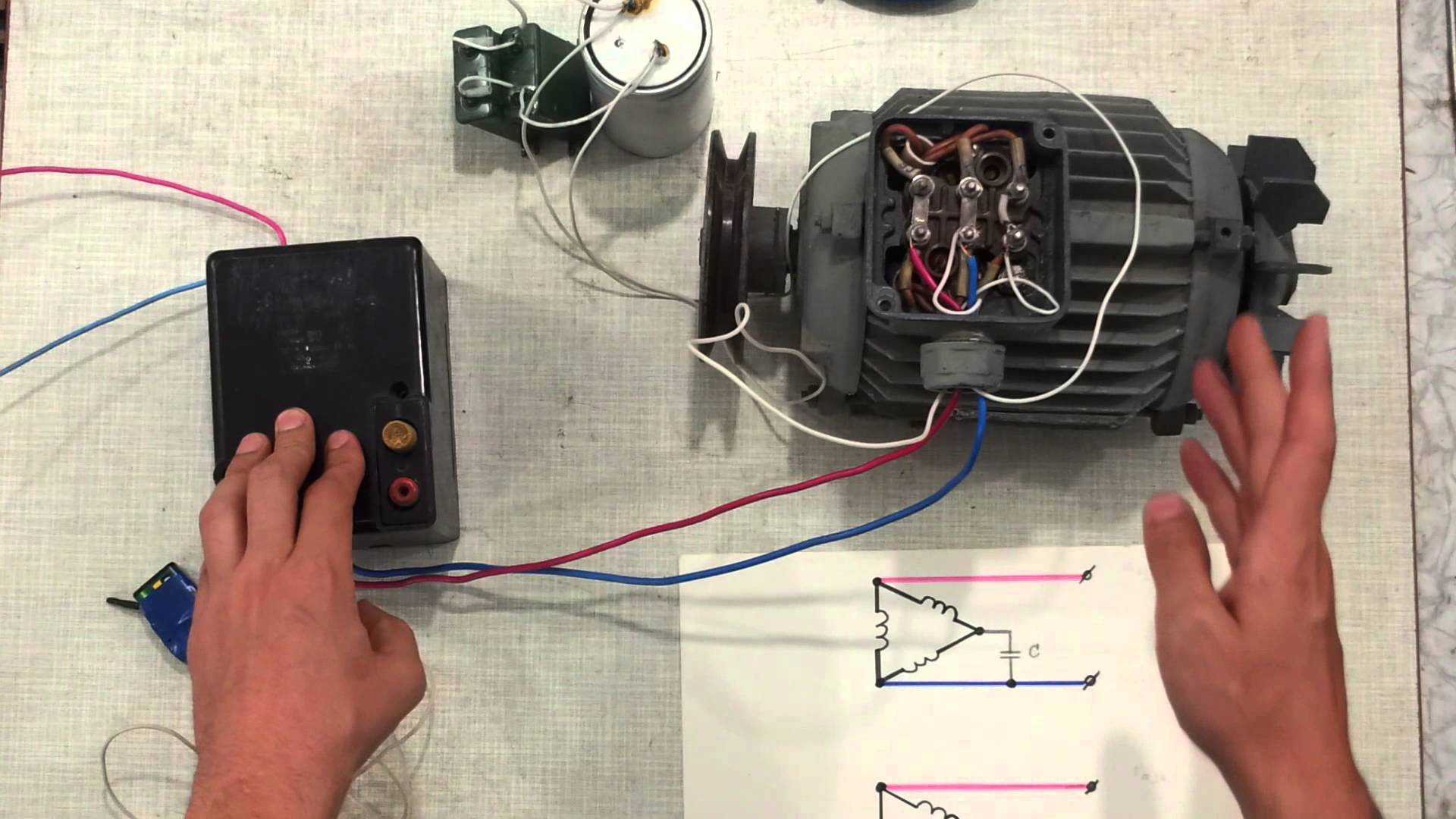 Более точно определить бифилярный или конденсаторный двигатель перед вами, можно при помощи измерений сопротивления обмоток. Если сопротивление вспомогательной обмотки больше в два раза (разница может быть еще более значительная), скорее всего, это бифилярный двигатель и эта вспомогательная обмотка пусковая, а значит, в схеме должен присутствовать выключатель или пусковое реле. В конденсаторных двигателях обе обмотки постоянно находятся в работе и подключение однофазного двигателя возможно через обычную кнопку, тумблер, автомат.