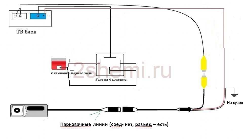 В первом случае минусовой провод видеокамеры подсоединяется к корпусу автомобиля. Видеовыход устройства предполагает разъем RCA на конце кабеля или переходник, который нужно подключить непосредственно к навигатору или к беспроводному радиопередатчику. Во втором случае КВЗ соединяется с навигатором с помощью специального радиопередатчика.