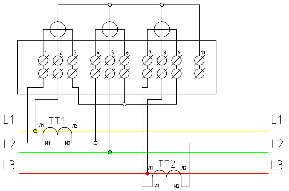 Цепи тока и напряжения в этой схеме, которую еще называют «десятипроводной» (по количеству используемых проводов), разделены. Подобное разделение цепей напряжения и тока позволяет повысить электробезопасность и легко проверять правильность подключения.