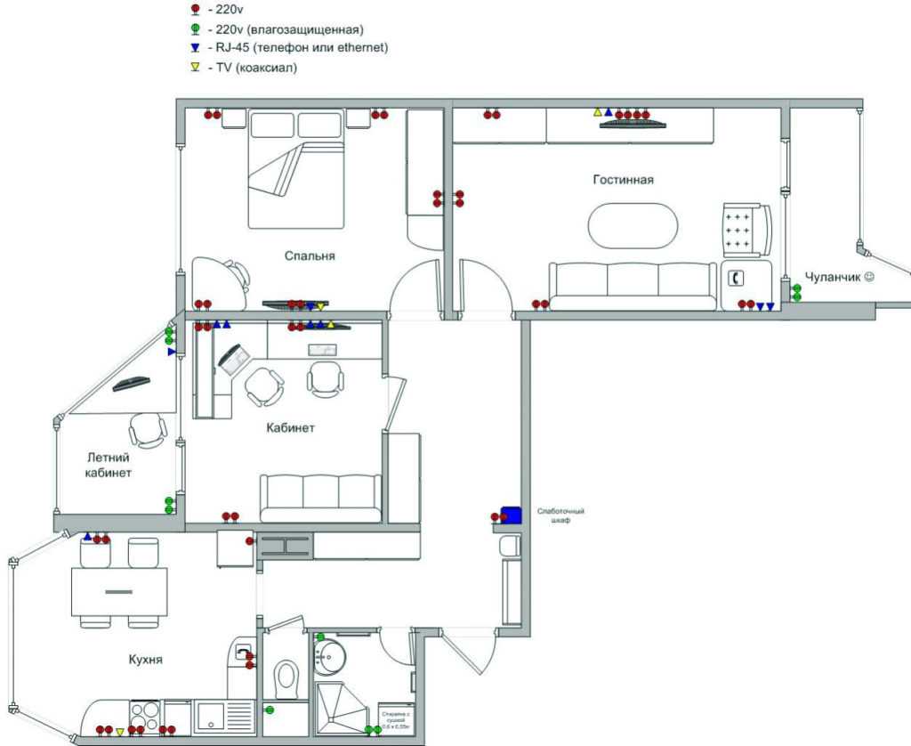 Здесь мы видим в какое помещение идут провода от распределительного щита, какие марки проводов используются, как расположены розетки на стенах и т.д.