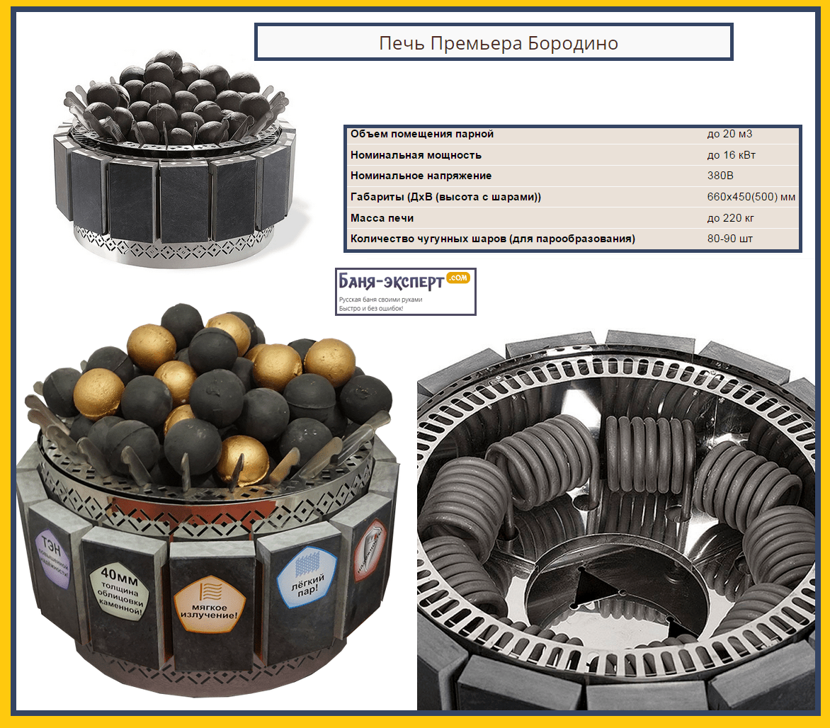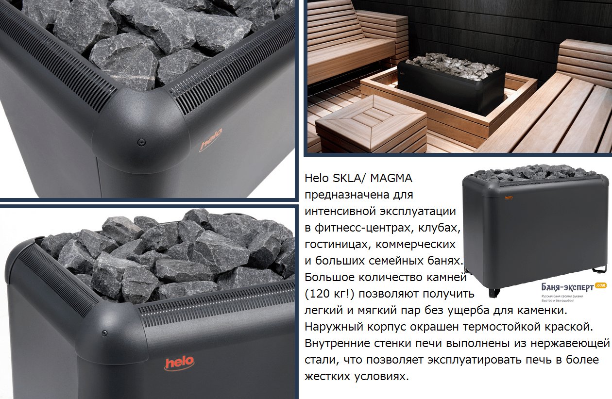 Расположение элементов нагрева спроектировано так, чтобы они максимально соприкасались с поверхностью камней, что увеличивает степень и скорость нагрева. Имеется встроенная панель управления.