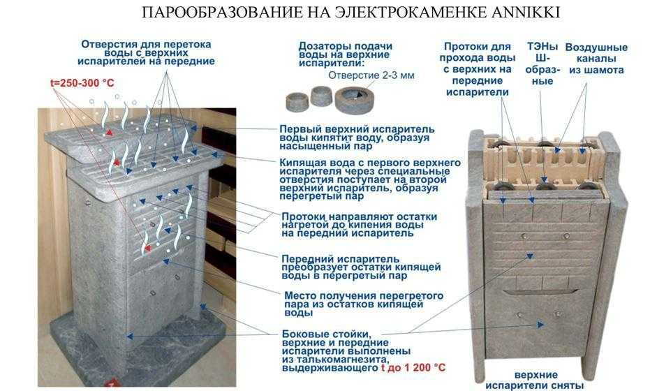 Благодаря электрической энергии ТЭНы (трубчатые электронагреватели) нагревают камни, расположенные сверху конструкции. Камни отдают тепло помещению, тем самым нагревая воздух. На камни выливают воду, так получается пар. Эта процедура безопасна, потому что попадая на раскаленные камни, вода моментально испаряется, не попадая на электронагреватели.