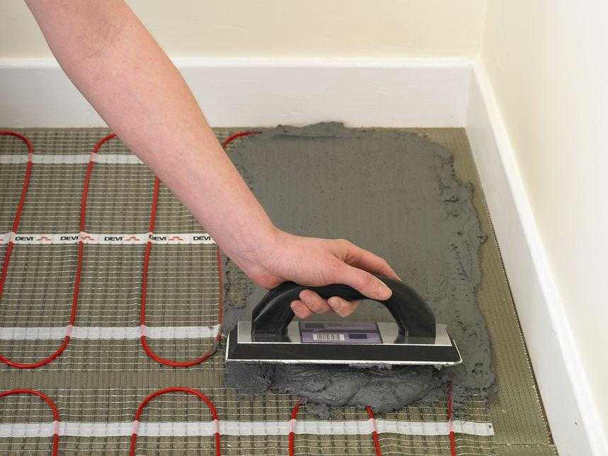 - Убедившись, что система работает исправно, можно приступать к укладке плитки. Специалисты рекомендуют нанести на всю поверхность пола термостойкий плиточный клей, который будет выдерживать высокую температуру. Достаточно, чтобы слой клея покрывал промежутки между кабелем. Укладка плитки производится по стандартной технологии прямо на поверхность нагревательного мата (без стяжки).
