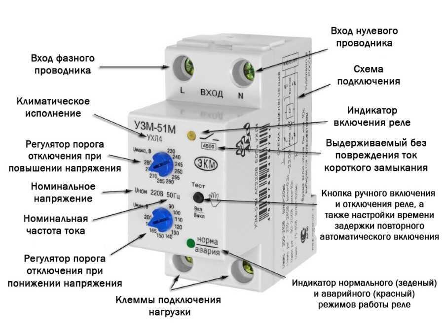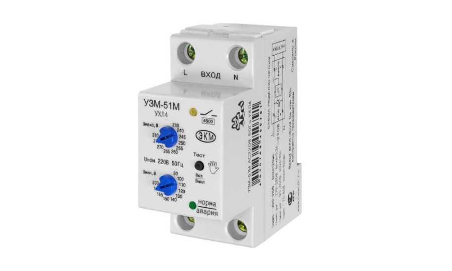 Рассматриваемой прибор – это устройство контроля напряжения в сети переменного тока, снабженное внутренним реле и варисторной системой защиты. На верхнюю часть пластмассового корпуса реле напряжения УЗМ-51м вынесены входные клеммы L и N, на нижнюю – выходные U и N. Они характеризуются туннельной конструкцией, что гарантирует качественный зажим кабеля площадью до 35 мм2.