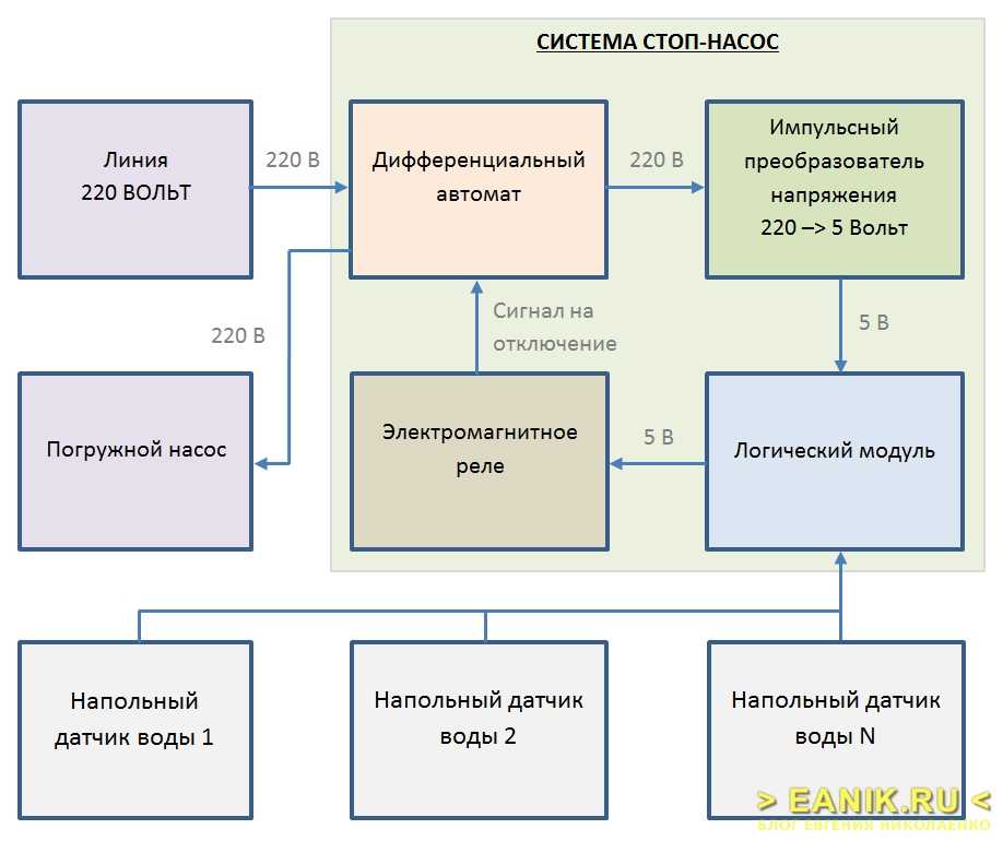 Как видно из схемы, при попадании воды на датчик, происходит срабатывание реле, которое посылает команду дифференциальному автомату на отключение. Происходит механический разрыв цепи переменного тока и насос отключается. При этом также отключаются и «мозги» системы, реагирующие на наличие воды на датчиках.