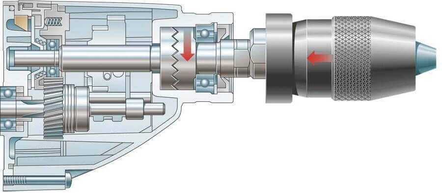 Она отличается от обычной встроенным механизмом для совершения поступательных движения – ударов. Их патроны аналогичны по конструкции, выглядят и устроены одинаково. Для удержания рабочей оснастки, сверла, например, используются трёхкулачковые патроны. Эта конструкция при вращении наружной обоймы патрона сдвигает кулачки друг к другу, с помощью чего и обеспечивается зажим сверла.