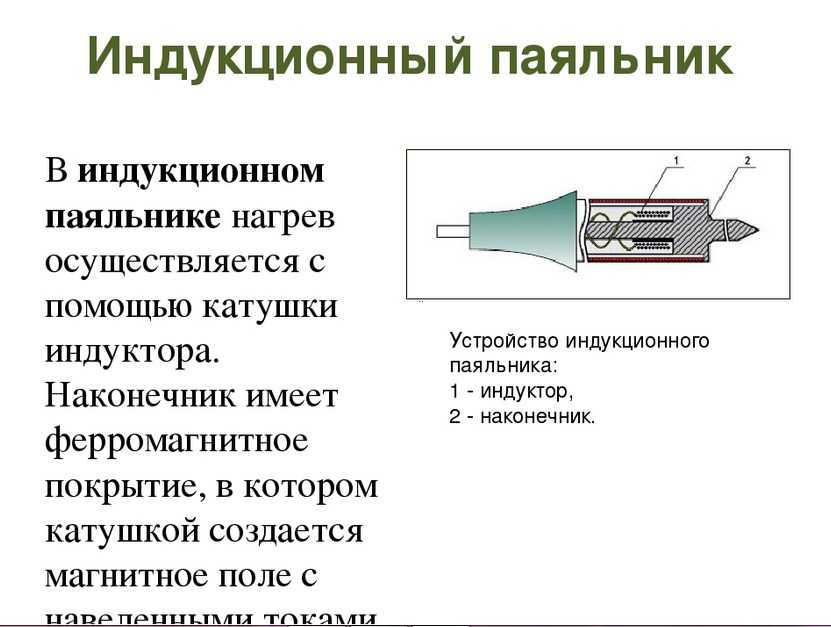 Рабочим органом такого оборудования является паяльник с установленным внутри него индуктором – катушкой из медной проволоки, намотанной вокруг гнезда, в которое вставляется хвостовик сменной насадки с ферромагнитным напылением.