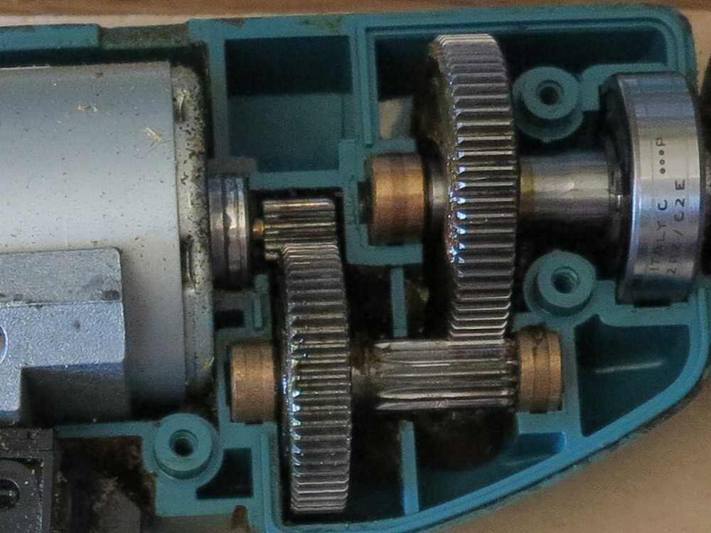У большинства дрелей редуктор устроен довольно просто – две плоские шестерни, которые изготовлены из металла либо твердого пластика. Для диагностики стоит заблокировать шпиндель двигателя и постараться провернуть шестерни
