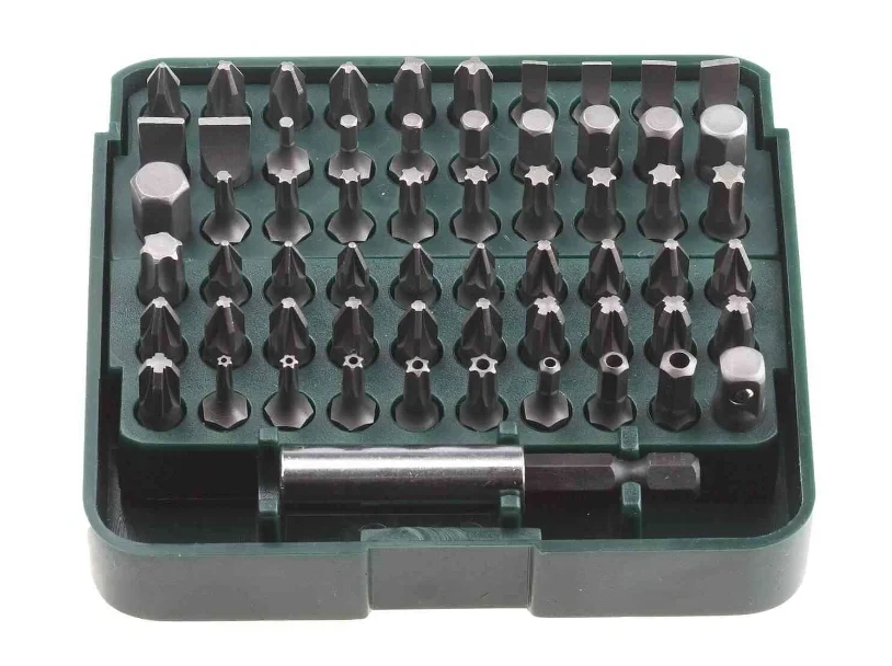 Набор состоит из 33 бит длиной 25 мм, изготовленных из кованой хромомолибденовой стали. В наборе также присутствует специальный магнитный адаптер, позволяющий осуществлять их оперативную смену. За счет наличия хвостовика 1/4″ их можно использовать со многими ручными и механизированными инструментами.
