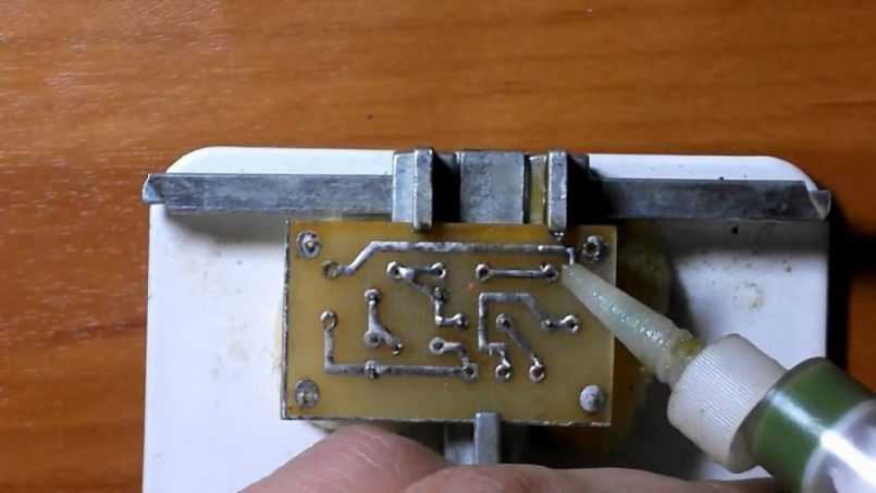 - Смазать флюсом и припаять каждую деталь — сначала резисторы с конденсаторами, потом — диоды, транзисторы, тиристор (симистор), динистор.