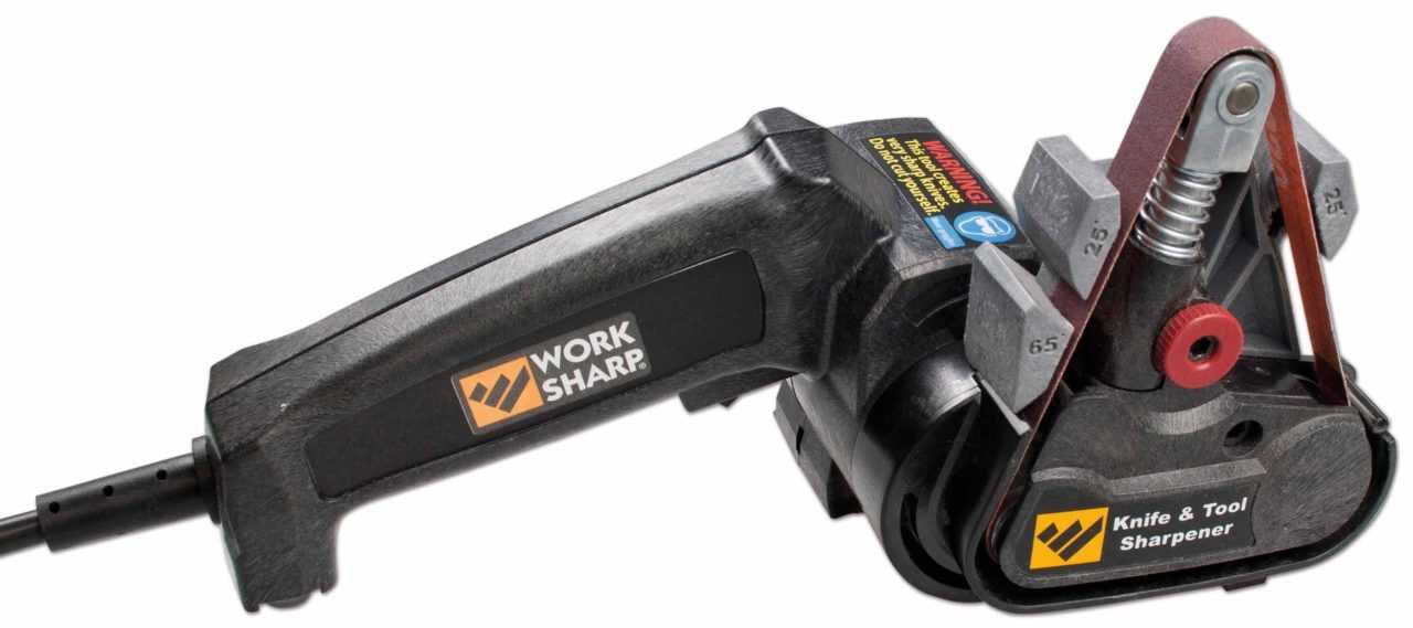 Вариант для работы с ножами разного типа славится настраиваемой направляющей и возможностью изменения скорости подачи абразивной ленты. Кроме того, достоинством здесь выступает допустимость применения лент любой зернистости.