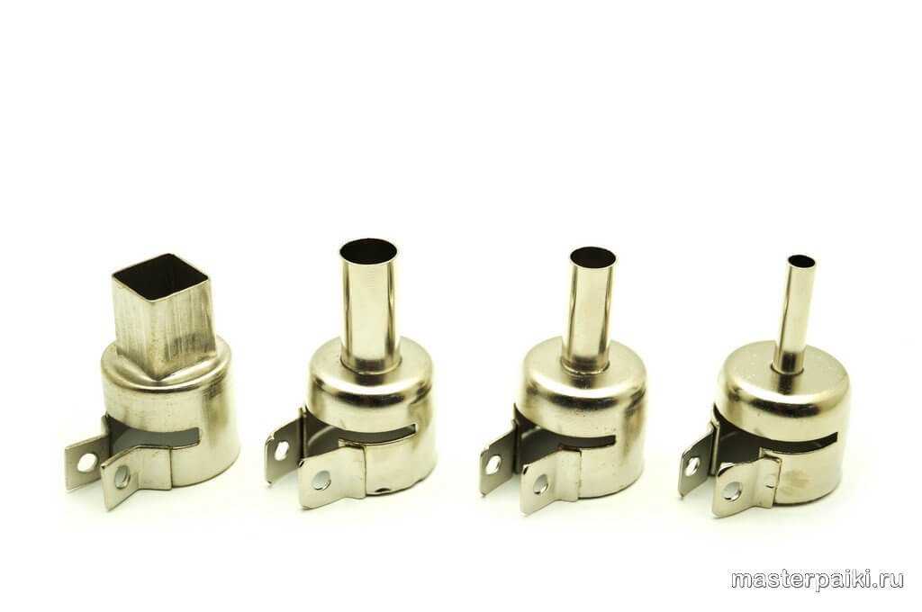 В комплекте паяльной станции предусмотрены 4 насадки для фена: три с цилиндрической формой сопла (от наименьшего к наибольшему диаметру) и одна насадка с квадратной формой, подходящей для монтажа и демонтажа элементов с большой площадью. Сами насадки надежно крепятся на фене при помощи винта и гайки, что с другой стороны не предусматривает «горячей» замены на ходу.