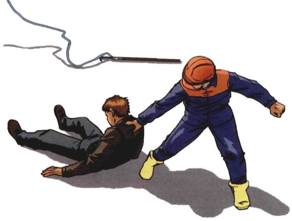 - если выключатель недоступен, электрод оттаскивают от человека (к примеру, оборвавшиеся провода) либо его от электрода (обычно достаточно отвести конечность). Имея под рукой резиновые перчатки, спасатель делает это непосредственно. За их отсутствием применяют предмет из диэлектрического материала: сухую деревянную палку или веревку, пластмассовую рукоятку, свернутый в трубку резиновый коврик. Если человек судорожно схватился за электрод, отрыв производят ударом палки по руке;