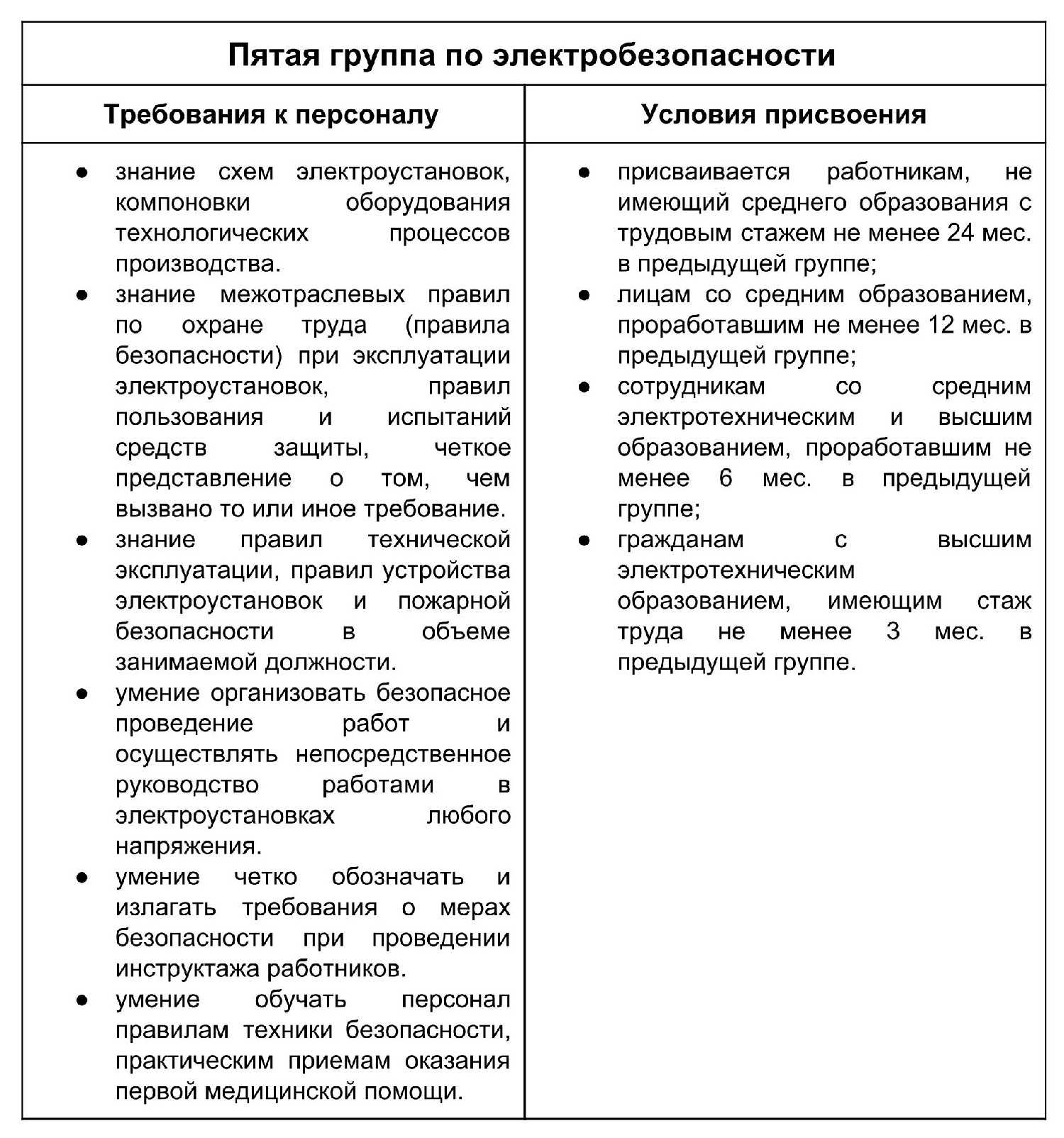 Пятую группу получает инженерно-технический персонал руководства производства. Такие люди знают нормы, имеют четкое представление о том, чем вызваны требования сроков испытания. Имеют понимание пожарной безопасности и охраны труда. Умеют обучать сотрудников, как оказывать первую помощь.