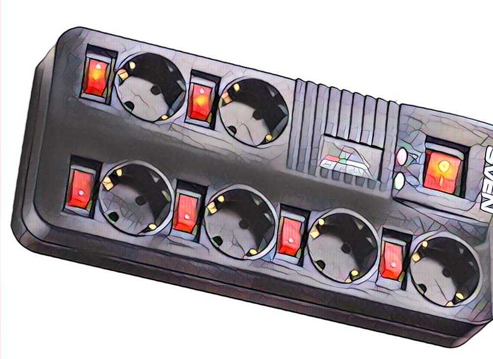 - Sven SV-0231018GR Pro. Комплектуется сразу восемью розетками с контактом заземления. Корпус выполнен из ABS пластика. Кроме, стандартной индуктивно-ёмкостной защиты, имеет в схеме варистор и автоматически восстанавливающийся предохранитель. Длина провода 1,8 метра.