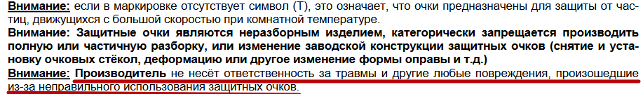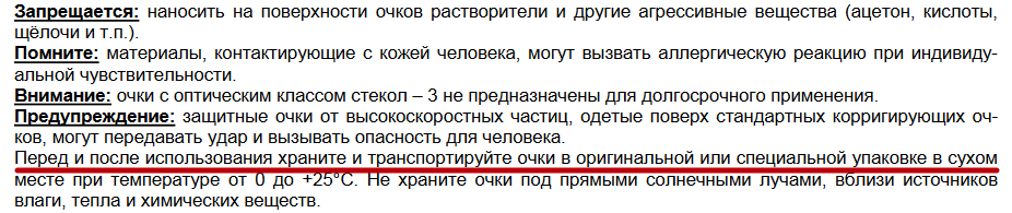 Поэтому в каждой инструкции по эксплуатации указано, например, что защитные очки нужно носить в футляре, не допускать их падения, ведь это может привести к растрескиванию линз и травме.