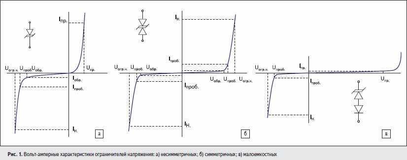 Для защиты цепей постоянного тока от импульсов ЭП по напряжению применяются полупроводниковые ограничители напряжения, или стабилитроны с несимметричной вольт-амперной характеристикой (рис. 1а). Несимметричность ВАХ обеспечивает защиту от импульсных ЭП определенной полярности на разных потенциальных уровнях. Пороговое напряжение этих приборов ниже напряжения ограничения, что обеспечивает их автоматическое отключение от цепи постоянного тока после прохождения импульса ЭП. Время включения этих приборов меньше времени самых быстрых переходных процессов, что также определяет предпочтительность их применения в цепях постоянного тока.