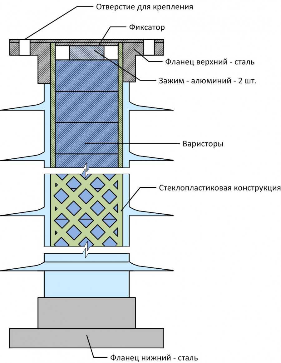 Если посмотреть на фото ограничителя от перенапряжения, то можно быстро разобраться даже на глаз во многих частях, из которых он состоит. Во главе угла тут варистор, который берет на себя роль переменного нелинейного резистора. Их в составе несколько штук. Все они размещаются в корпусе, которые выполнен из фарфоровой части и полимеров высокой прочности.