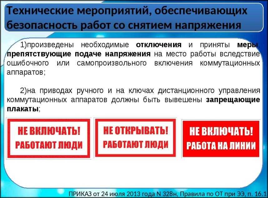 Важно! Такое отключение производится в обязательном порядке перед проведением основных технических работ, а проверка факта отключения проверяется самим ответственным должностным лицом