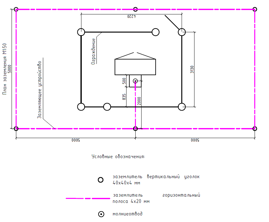 Молниеотвод подключается к комбинированному заземляющему устройству, состоящему из горизонтальных (полоса 4х20) и вертикальных заземлителей (уголок 40х40х4).