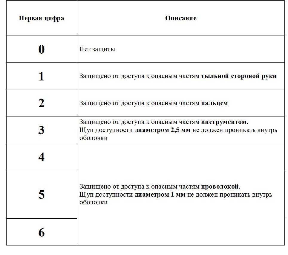 Таблица защиты ip от внешних твердых предметов (первая цифра)