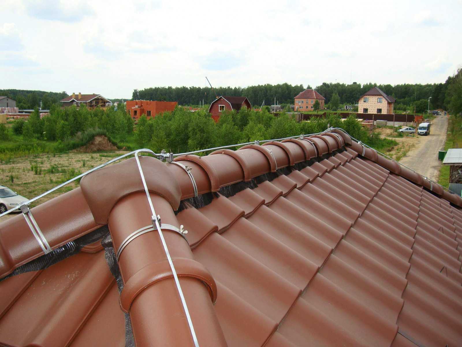 Используется трос, который натягивается по всей длине конька крыши и закрепляется на деревянных опорах. Важным условием является натяжка троса – он не должен касаться крыши.