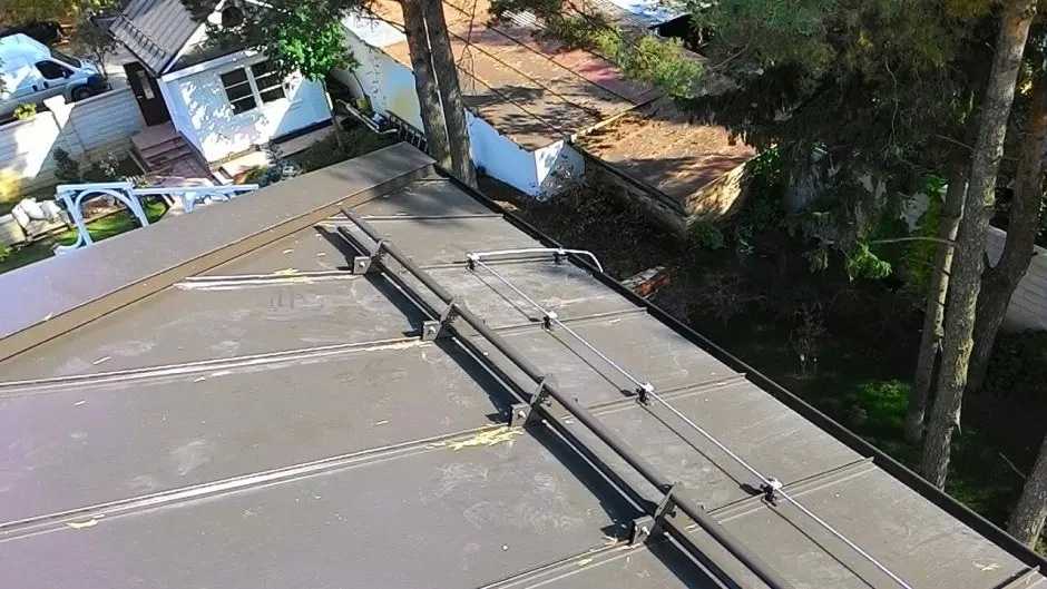 Вдоль крыши протягивают стальной трос сечением не менее 35 кв. мм. Если не получается найти трос нужной длины его соединяют, зачаливая с перехлестом в 1,5 м и более.