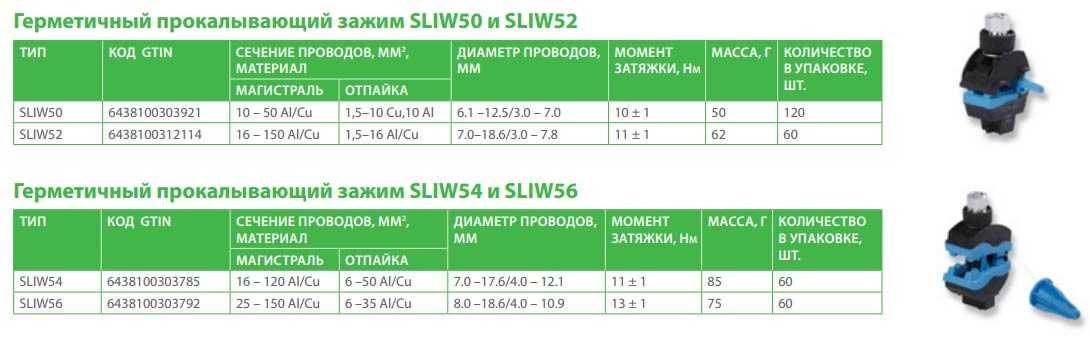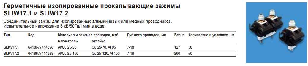 Например, герметичный зажим SLIW54 16-120/6-50. Первая надпись означает магистраль от 16мм2 до 120мм2 включительно. Вторая – сечение отпаечного кабеля или СИП, которые можно подключать через этот прокол. При выборе, лучше покупать орехи ближайшие к большим сечениям подключаемого провода, чтобы обеспечить лучший переходной контакт.