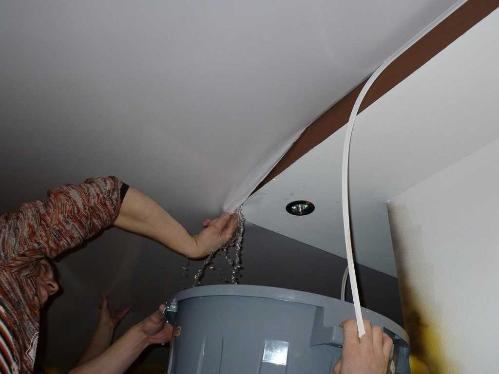 Если в квартире сделаны виниловые натяжные потолки, в пространстве между полотном и плитой перекрытия наверняка скопилось много воды. При небольшом заливе такие потолки могут даже защитить комнату. Главное потом аккуратно воду слить через отверстие точечного светильника. Неповрежденные механически потолки из ПВХ от воды практически не страдают, после просушки их можно использовать и дальше.