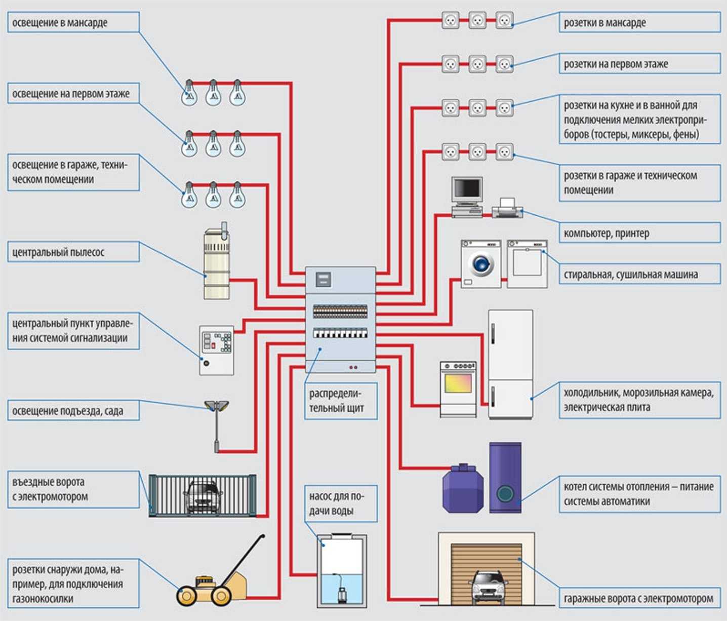 Чтобы нагрузка во внутридомовой сети распределялась равномерно, на схеме разводки проводов потребители разбиваются на несколько групп. Например, одна идет на уличное освещение придомового участка, вторая на хозпостройки, третья на осветительные приборы в коттедже и четвертая на розетки в нем. Если дом большой, то такая разбивка может производиться по этажам и помещениям.