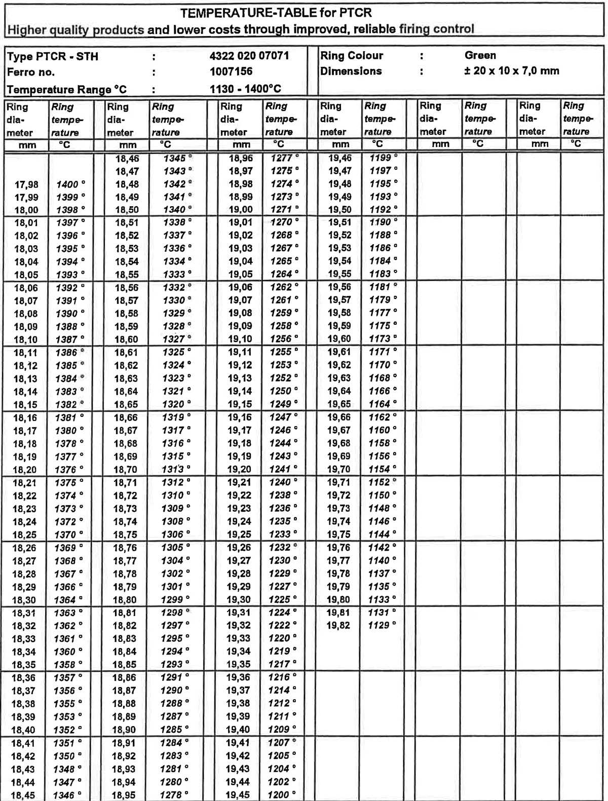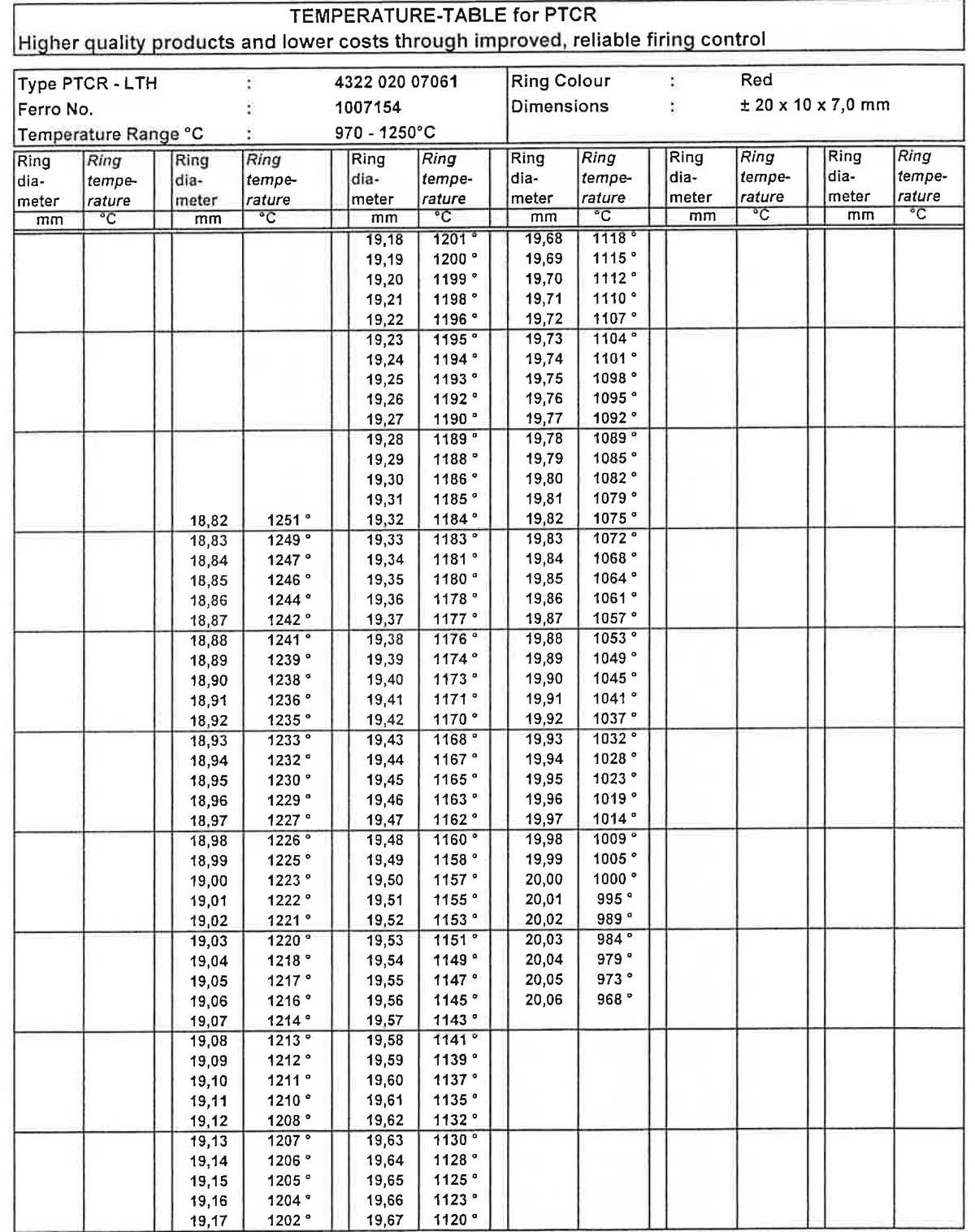 Температурные кольца PTCR являются относительно новым методом применения пироскопов. С их помощью также можно определять количество поглощаемого керамикой тепла. Данный вариант является более точным, чем предыдущий. При повышении температуры кольца уменьшаются в размере, и использование микрометра для определения размеров кольца после обжига даст возможность перевести полученную величину в температурный эквивалент. Точное соответствие диаметров колец и температур PTCR STH и LTH представлены в таблице ниже.