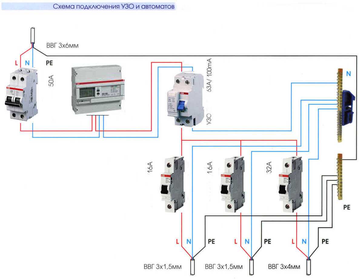 К входной клемме устройства с маркировкой N необходимо подключить нулевой кабель, отсоединенный от корпуса щитка. Перед началом работ по подключению, рекомендуют нарисовать принципиальную схему подключения. Распространённая и часто применяемая на практике схема разводки питающей сети в частном доме. Дело в том, что в этих случаях, величины тока недостаточно, чтобы отключился автоматический выключатель, рассчитанный на работу со сверхтоками перегруза и короткого замыкания.