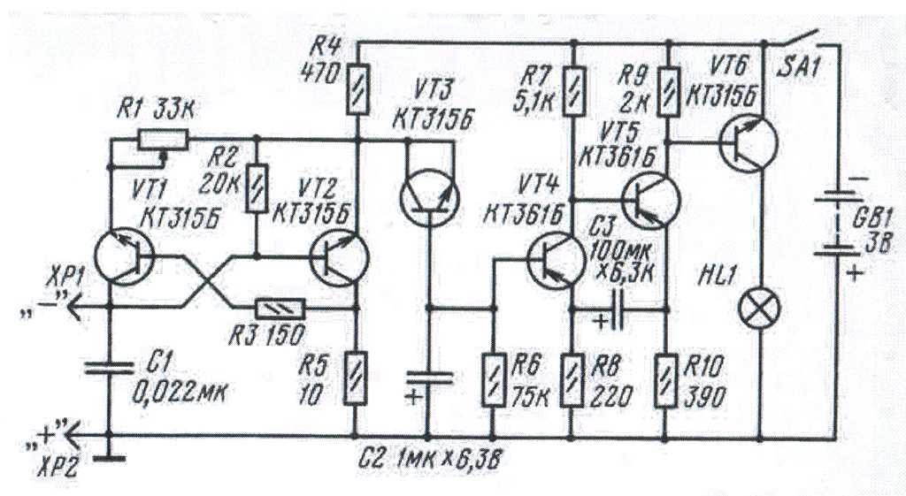 Вместо VT1— VT3 можно ставить КТ358В или КТ312В. КТ361Б легко заменяются на КТ502, КТ209. При использовании светодиода необходимо последовательно с ним включать сопротивление около 30-60 Ом.; питания прибора осуществляется от источника — 3В. При использовании кроны целесообразно применить стабилизатор на 3,3В.