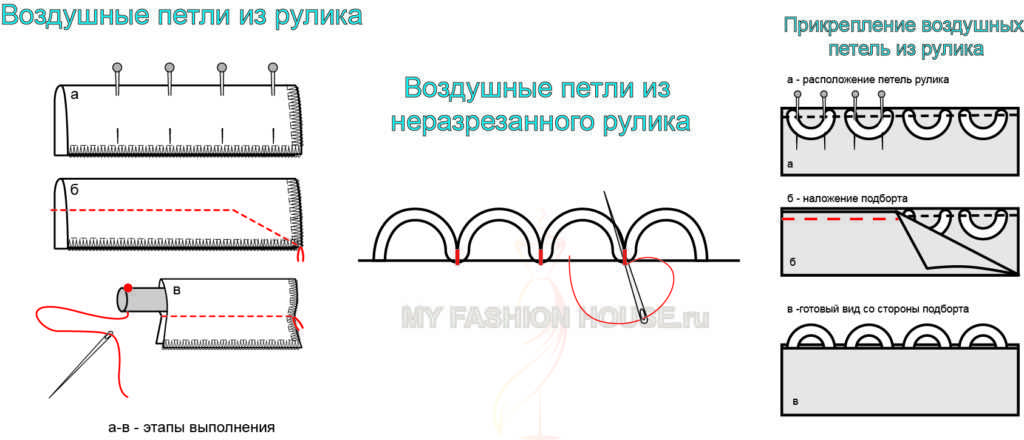 Воздушные обмётные петли выполняют шелковыми ниточками по краю изделия. Длина петли соответствует диаметру и толщине пуговицы. Петлю формируют из нескольких (4—6) ниток, протаскивая их через край. Проложенные нитки обметывают равномерными стежками.