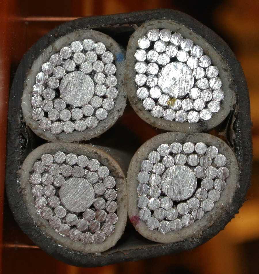 - Основа конструкции — проводники из алюминия. Они могут быть как однопроволочными, так и многопроволочными, секторной или круглой формы. Допускается наличие в одном кабеле 2–3 жил секторной формы, и одной — круглой, но не наоборот. Сечение каждой жилы — от 35 до 240 мм квадратных. Количество жил — от 1 до 4.