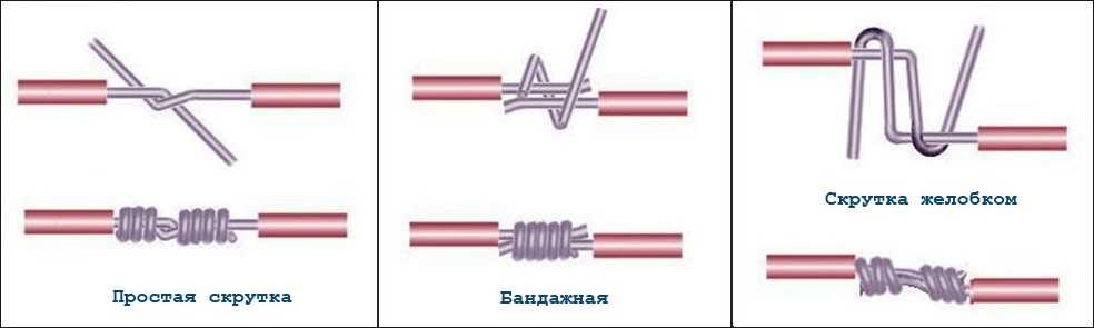 Известны простые способы, с помощью которых реально безопасно и прочно произвести соединение. Они не представляют сложности даже для новичка. При выполнении допускается использование как двух проводов, так и нескольких. Обычно используют следующие известные виды скруток: