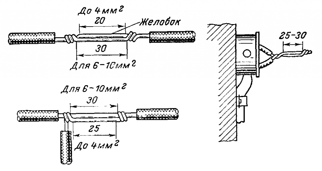 Бандажная скрутка применяется, чтобы делать соединения проводов большого диаметра. Чтобы обеспечить прочное соединение алюминиевых жил, используется скрутка желобком.