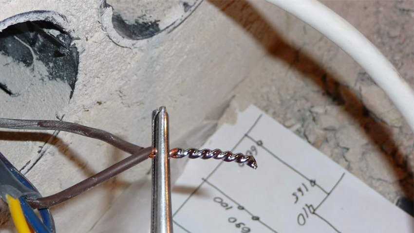 удерживая одними плоскогубцами провода в точке пересечения, другими закручивают их в тугой жгут. Чтобы не повредить инструментом изоляцию, их обматывают изолентой;