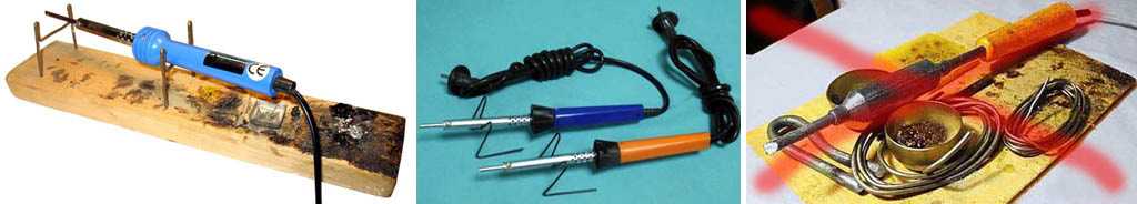 Ах да, подставки для паяльников. Классическая, слева на рис., пригодна для любых стержневых. Где на ней быть ванночкам для припоя и канифоли – дело ваше, какой-либо регламентации нет. Для маломощных паяльников с фартуком пригодны упрощенные подставки-скобы, в центре.